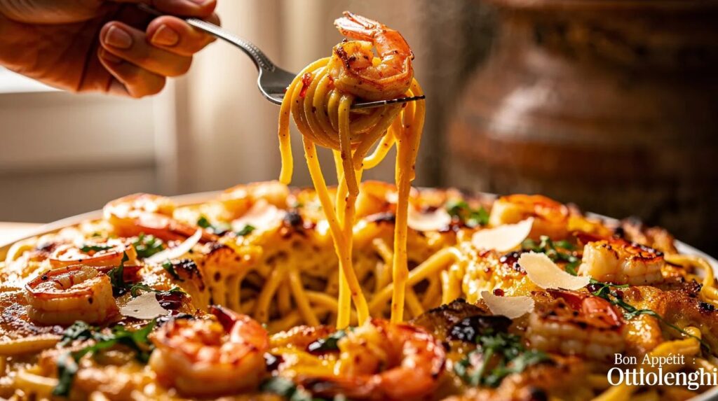 The baked pasta format adds another layer of American practicality: a one-dish meal that can be assembled ahead, feeds a crowd without fuss, and yields that crispy-topped, bubbling-edged result that no stovetop pasta can replicate. Adding shrimp firmly places it in the coastal American South's canon of comfort food—a tradition that treats seafood not as luxury but as a weeknight staple. This version honors that spirit while integrating the technique of roasting garlic, common in French and Spanish cooking, to enhance complexity without demanding more effort.