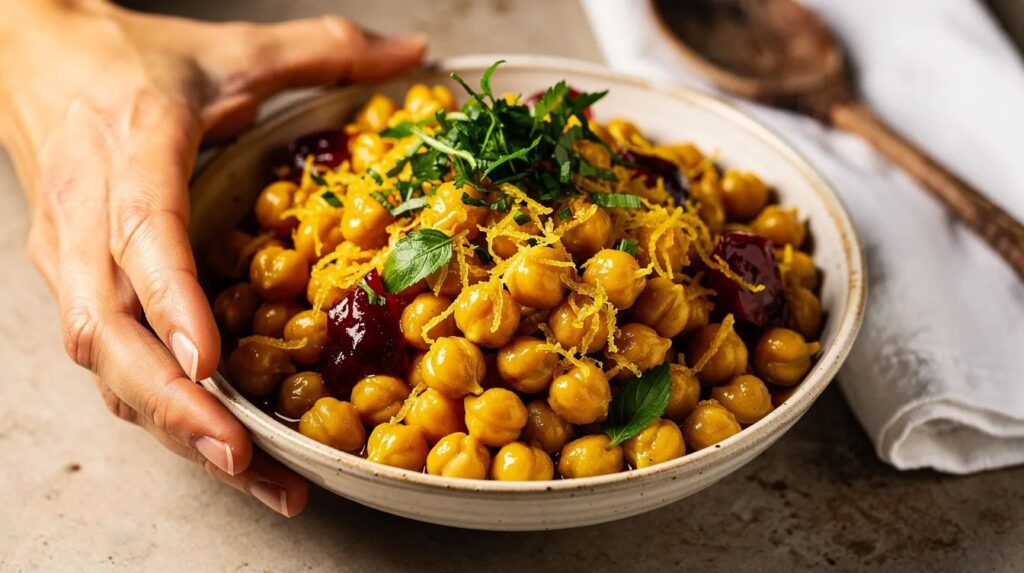 Chickpeas braised with lemon and olive oil belong to a broad Mediterranean and Middle Eastern tradition that stretches from Catalonia to Lebanon, from the Sicilian coast to the markets of Marrakech. The legume itself — Cicer arietinum — has been cultivated for more than ten thousand years and remains one of the most consumed plant proteins on earth. Its affinity with citrus is not incidental: the fat-soluble aromatic compounds in lemon zest bind to olive oil in a way that makes the whole dish smell louder and more complex than its parts suggest.